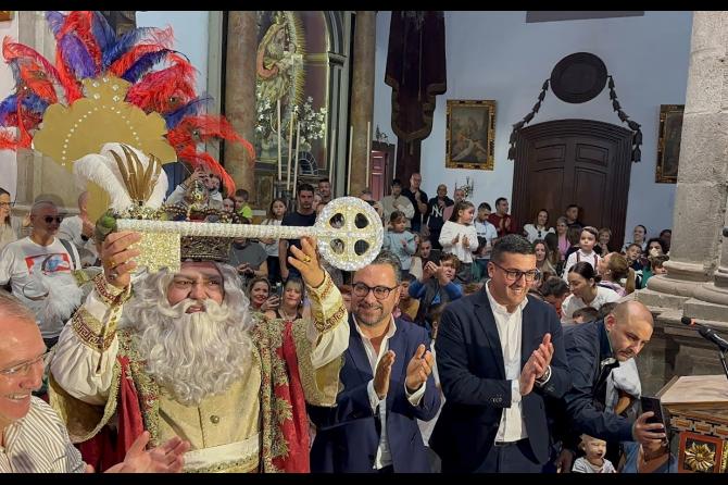 A mediodía, cientos de niñas y niños esperaban a la comitiva real tanto en la entrada de la iglesia matriz de El Salvador como en el interior, donde se produjo formalmente la entrega de la llave mágica tras su salida del Ayuntamiento de Santa Cruz de La Palma.