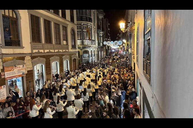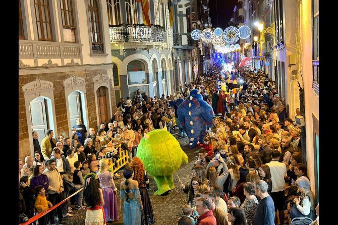 A partir de este punto, el bullicio y la expectación propio del público infantil ante tan deseada visita, se hizo presente entre sonrisas, aplausos y gritos para corear los nombres de los Reyes Magos de Oriente.A lo largo de la calle Real y de la calle Anselmo Pérez de Brito ocho carrozas desfilaron para el disfrute de grandes y pequeños con la ambientación musical de la Banda Municipal de Música San Miguel, la formación de cornetas y tambores Gayfa, la agrupación Dixieland y las coreografías de baile preparadas para la ocasión por parte de la Escuela Municipal de Danza 'Maika Lerín', junto a una destacada representación a pie de calle de personajes de dibujos animados, zancudos y muñecos de luz.