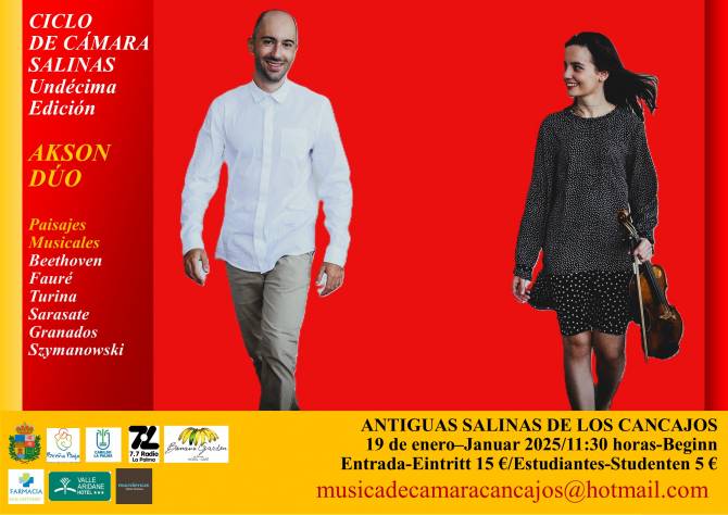 El domingo 19 de enero a las 11.30 hs, tendrá lugar el segundo concierto de la Undécima Edición del Ciclo de Cámara “Salinas” en Las Antiguas Salinas de Los Cancajos, con la actuación de “Akson Dúo”, formado por Luis López al piano y Julia Nikoliszak al violín.