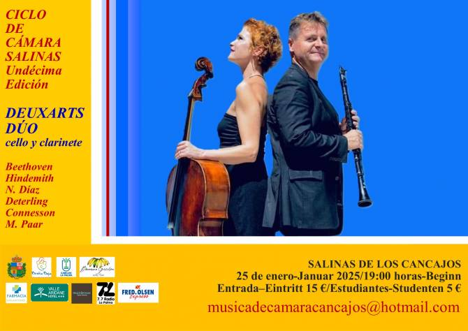 El sábado 25 de enero a las 19 hs, tendrá lugar el tercer concierto de la Undécima Edición del Ciclo de Cámara “Salinas” en Las Antiguas Salinas de Los Cancajos, con la actuación de “Deuxarts Dúo”, formado por Radovan Cavallin al clarinete y Jelena Ocic al cello.