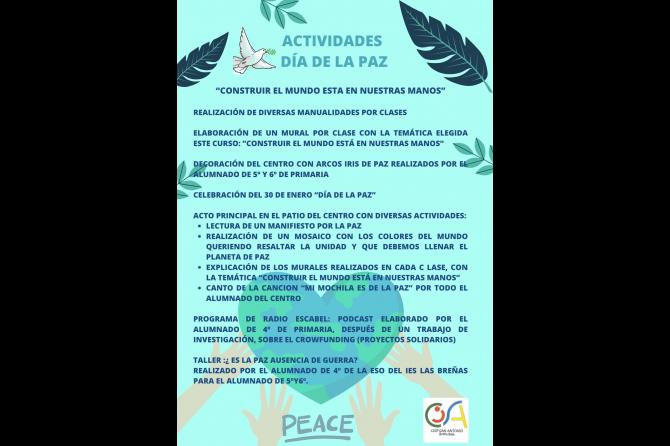 Desde el “Ceip San Antonio”, durante toda la semana, se han puesto como lema “Construir el mundo esta en nuestras manos” para la elaboración de murales y manualidades por clases, y decoración del centro con Arco Iris de Paz. Como actos para el Día de La Paz habrá lectura de un manifiesto, realización de un mosaico y canto de la canción “Mi mochila es de la Paz”. Además de la elaboración de un podcast para Radio Escabel sobre “Proyectos Solidarios” y un Taller “¿Es la Paz ausencia de guerra?”, por el alumnado de 4º de la ESO del IES “Las Breñas”.
