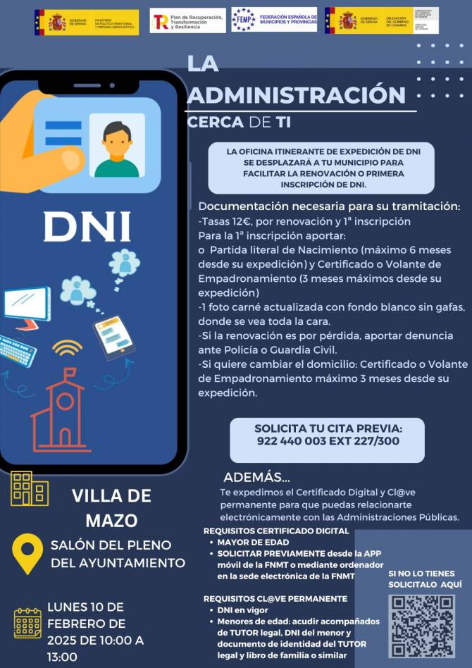El Ayuntamiento de Villa de Mazo habilitará el próximo 10 de febrero una oficina itinerante de expedición del Documento Nacional de Identidad (DNI), con el objetivo de acercar este servicio a la ciudadanía y facilitar la renovación o primera inscripción de este documento.