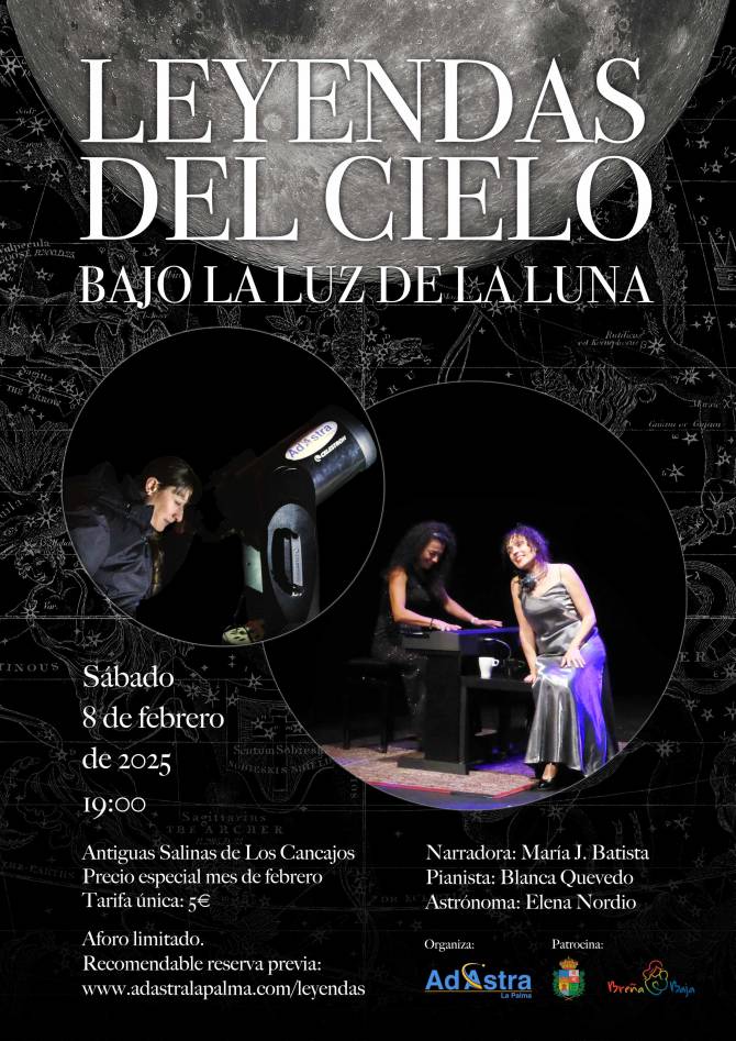 Ad Astra La Palma y el Ayuntamiento de Breña Baja organizan para el sábado 8 de febrero, 19 hs, “Leyendas del Cielo bajo la Luz de la Luna” en las Antiguas Salinas de Los Cancajos. Donde los asistentes, descubrirán un verdadero deleite para los sentidos y el alma de la mano de una narradora oral, una pianista y una astrónoma.