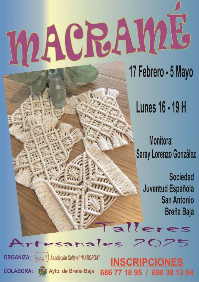 La asociación cultural “Maborga” pone en marcha las inscripciones para el Taller de “Macramé” en la Sociedad Juventud Española de San Antonio que se desarrolla del 17 de febrero al 5 de mayo. Colabora la Concejalía de Artesanía del Ayuntamiento de Breña Baja.