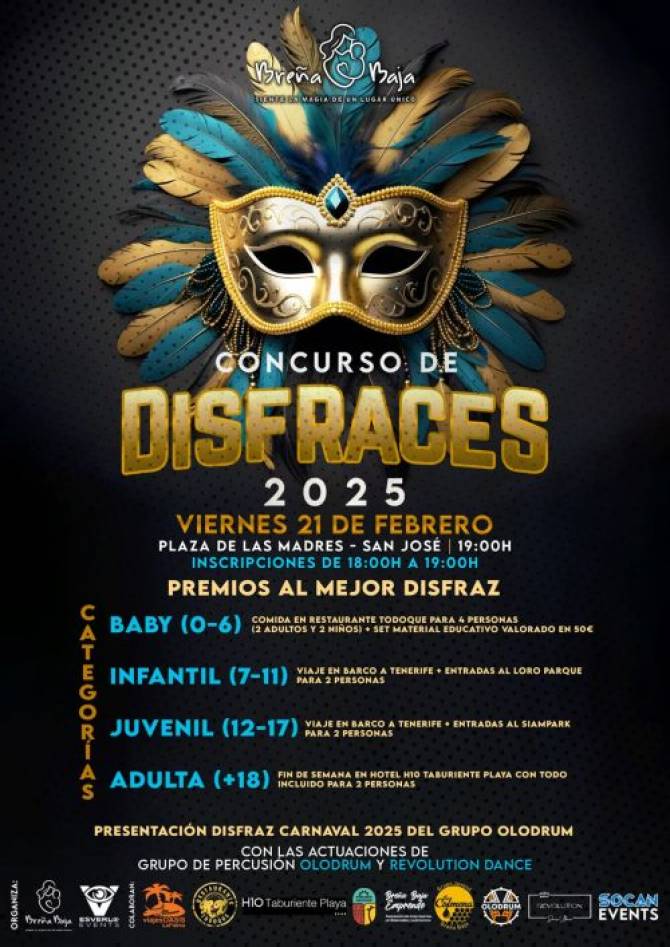 El viernes 21 de febrero a las 19 hs. tendrá lugar, por decima ocasión, el “Concurso de Disfraces” en la Plaza de Las Madres de San José, organizado por el Ayuntamiento de Breña Baja y la Asociación Esverlo Events. Se cuenta con la colaboración de la Asociación de Empresarios “Breña Baja Emprende”, Grupo juvenil “La Colmena”, Viajes Oasis, H10 Taburiente y Socan Events.