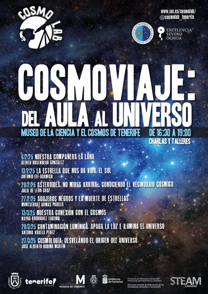 Este ciclo de charlas CosmoViaje se enmarca dentro del proyecto educativo CosmoLab financiado por el Cabildo de Tenerife y cuenta con la colaboración de la Consejería de Canarias y del Museo de la Ciencia y el Cosmos, del Cabildo de Tenerife.