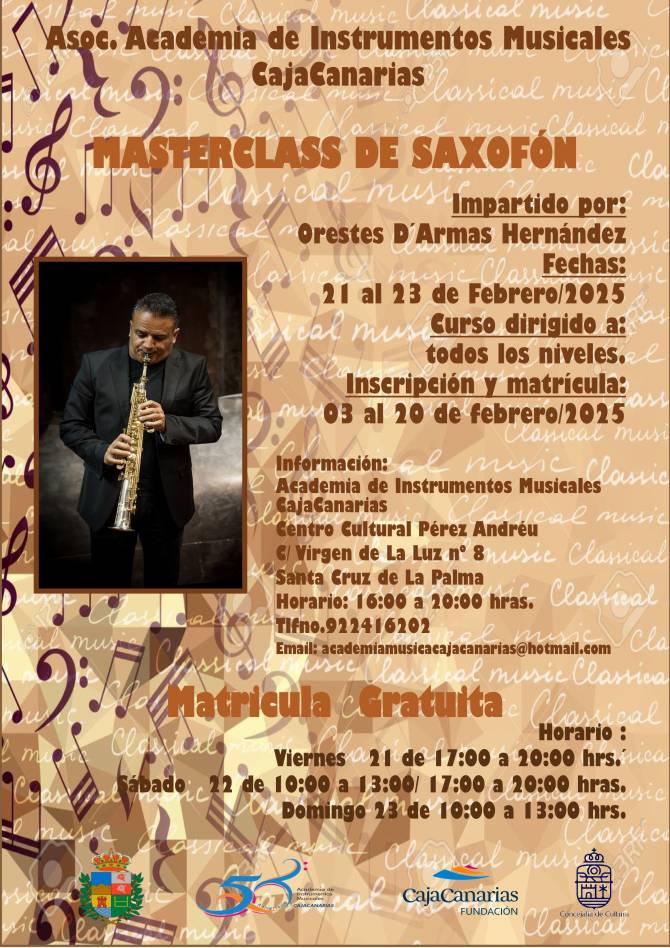 La Asoc. Academia de Instrumentos Musicales CajaCanarias celebrará del 21 al 23 de febrero, una masterclass de saxofón dirigida a alumnos/as de todos los niveles, con carácter gratuito. Estará impartida por D. Orestes D´ Armas y colaboran la Fundación CajaCanarias y los Ayuntamientos de Breña Baja y Santa Cruz de La Palma.