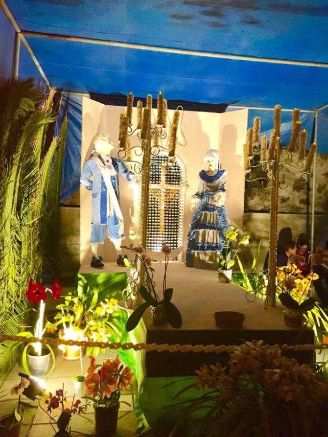 Se adorna con joyas y flores, se forra con tela y se emplean materiales artificiales (papel rizado, entre otros) y naturales. Recientemente se ha introducido la costumbre de “los mayos”, creando un ambiente festivo en toda la plaza.