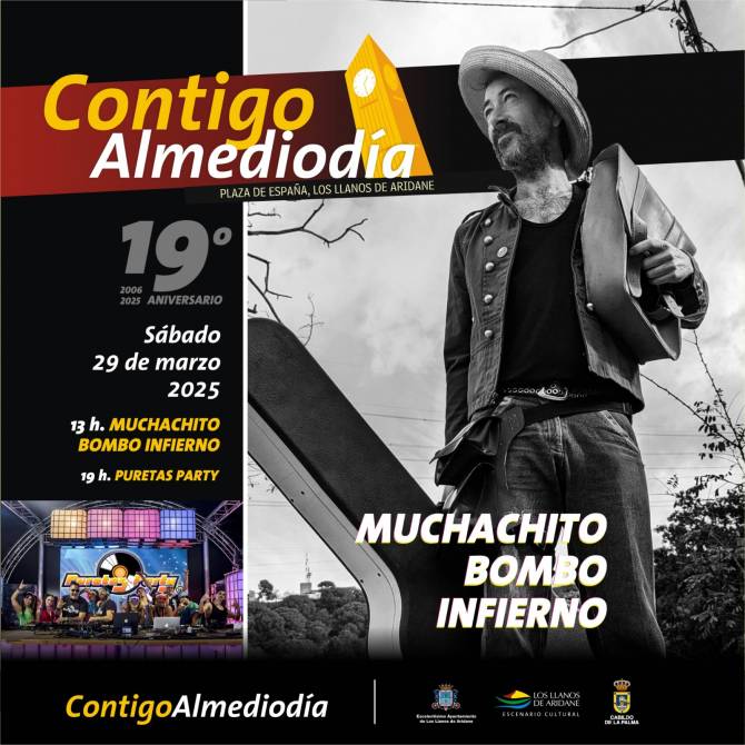 El Ayuntamiento de Los Llanos de Aridane celebra el XIX Aniversario de Contigo Almediodía, que tendrá lugar el próximo 29 de marzo en la Plaza de España. Este evento, consolidado como uno de los más relevantes en la agenda cultural de La Palma, contará con una programación especial que se extenderá hasta la noche. La jornada comenzará con la actuación de Muchachito Bombo Infierno a las 13:00 horas, seguida de Puretas Party a las 19:00 horas.