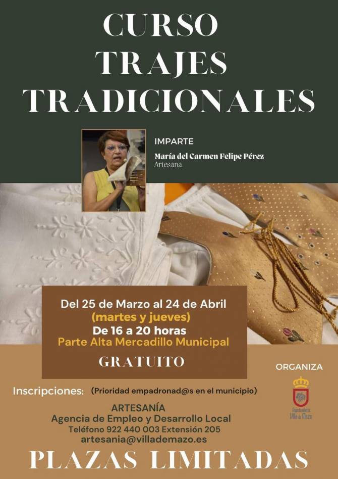 Por otro lado, el curso de Trajes Tradicionales será impartido por la artesana María del Carmen Felipe Pérez y dará comienzo el 25 de marzo. Las clases se llevarán a cabo los martes y jueves en horario de 16:00 a 20:00 horas en el aula situada en la parte alta del Mercadillo Municipal.