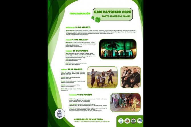 El concejal de Cultura, Alberto Perdomo, destaca la variedad de actividades que se desarrollarán a lo largo de la semana, pensadas para todos los públicos. La programación arrancará el miércoles 12 de marzo en el Salón de actos Sociedad La Investigadora con la lectura de varios cuentos irlandesas a cargo del Club de Lectura Sentilibro, la impartición de la charla "Colonos irlandeses en La Palma y Matías Rodríguez Felipe "El Damo", a cargo de Fulgencio García Expósito y una degustación de platos tradicionales de la gastronomía irlandesa.
