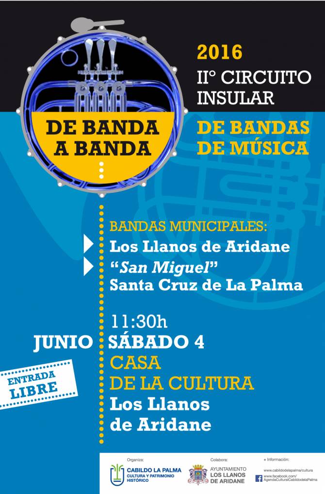 El II Circuito de Bandas Municipales de Música De Banda a Banda, que organiza el Cabildo Insular de La Palma a través de la Consejería de Cultura y Patrimonio Histórico, que dirige Primitivo Jerónimo, celebra una nueva actuación este sábado, 4 de junio, en Los Llanos de Aridane, con entrada libre.