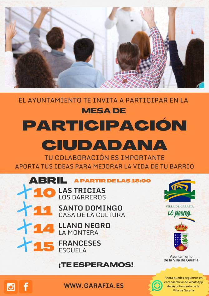 El Ayuntamiento de la Villa de Garafía pone en marcha un proyecto para la dinamización de la participación ciudadana durante este 2025. Esta iniciativa que surge de la voluntad del equipo de Gobierno de generar espacios democráticos de participación y escucha activa con los vecinos para la consolidación de un gobierno abierto, dará comienzo este mes de abril.