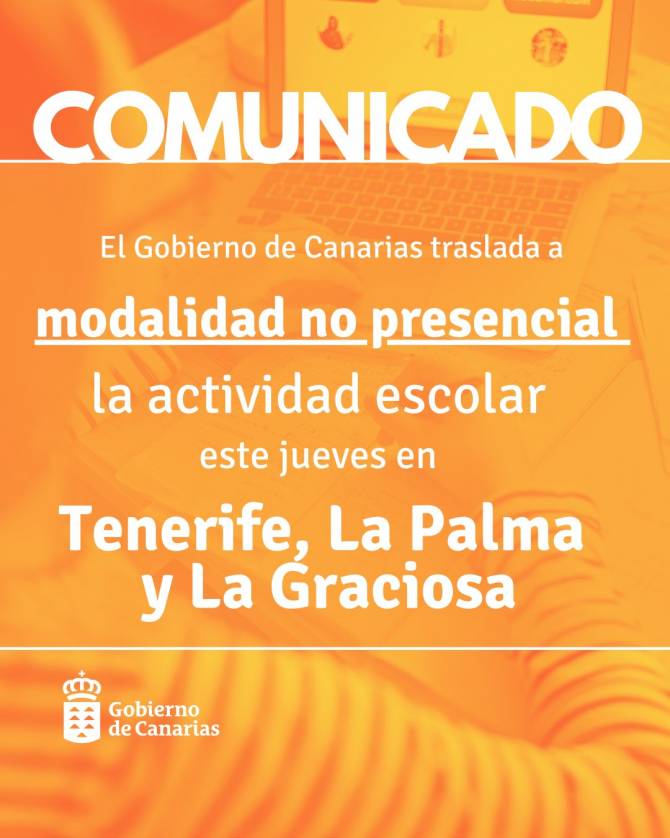 La Consejería de Educación, Formación Profesional, Actividad Física y Deportes del Gobierno de Canarias ha anunciado que, debido a la actual situación meteorológica y la declaración del estado de alerta máxima por vientos y alerta por fenómenos costeros, las clases presenciales se suspenderán el jueves 3 de abril de 2025 en las islas de Tenerife, La Palma y La Graciosa. La actividad escolar se llevará a cabo de forma no presencial en la medida de lo posible.