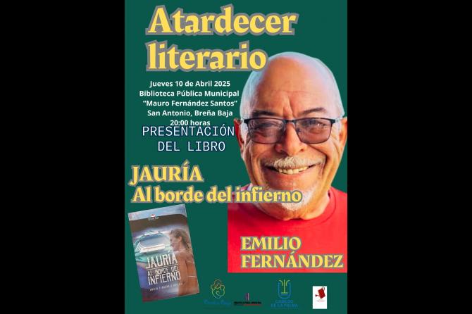 El jueves 10 de abril, a las 19 hs, en la Biblioteca Pública Municipal “Mauro Fernández Santos” de San Antonio se celebra un Atardecer Literario con Emilio Fernández, presentando su nuevo libro "Jauría al borde del infierno". Organiza la Concejalía de Cultura del Ayuntamiento de Breña Baja.