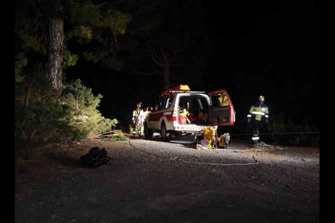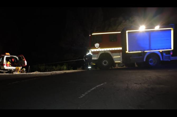 En la noche de ayer, efectivos del Parque de Bomberos de La Grama intervinieron en un delicado rescate en la carretera LP-4, a la altura del cruce del Pico de la Nieve, tras la salida de vía de un vehículo que quedó detenido a mitad de una ladera con una persona en su interior.