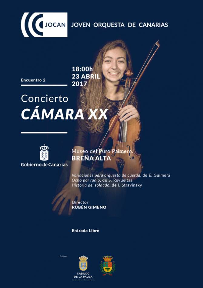 El Cabildo Insular de La Palma también colabora este domingo, 23 de abril, junto al Ayuntamiento de Breña Alta, con la programación del concierto Cámara XX que realizará la Joven Orquesta de Canarias (JOCAN), dependiente de la Consejería de Cultura, Turismo y Deportes del Gobierno de Canarias, en el Museo del Puro Palmero, a partir de las 18:00 horas.