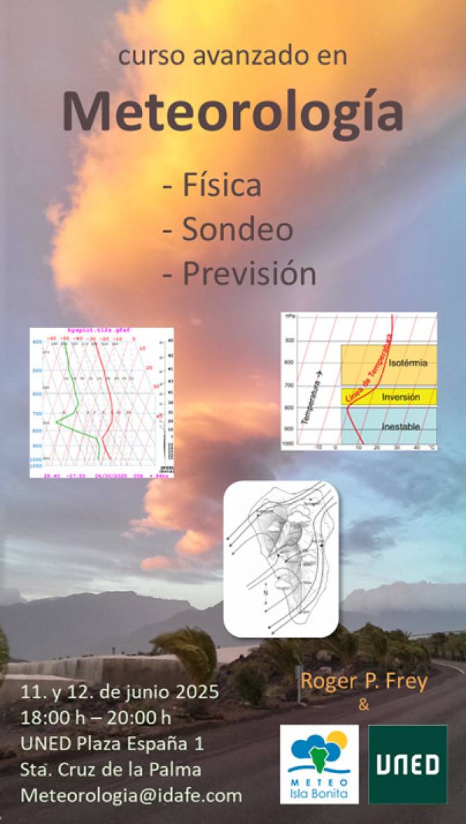 Este curso-taller se celebrará en la sede de la UNED situada en Plaza de España, Santa Cruz de La Palma, y está orientado a personas interesadas en comprender mejor los procesos meteorológicos, aprender a interpretar sondeos atmosféricos y mejorar sus habilidades en previsión del tiempo.