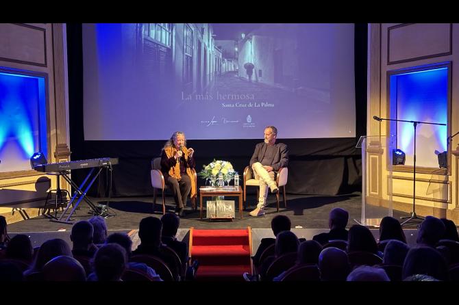 El teatro Chico de la capital palmera acogió este lunes, 5 de mayo, la presentación de la obra 'La más hermosa. Santa Cruz de La Palma', un trabajo fotográfico del artista Emilio Barrionuevo acompañado de textos de la escritora y Premio Canarias de Literatura, Elsa López.