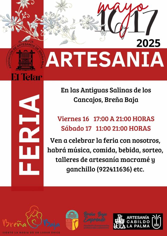 Habrá un sorteo de una cesta de productos artesanales antes de culminar la feria, en el último día. Por otro lado tendremos talleres artesanales (macramé y ganchillo), contactar a los tlfos: 922 41 16 36.