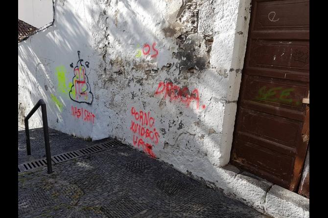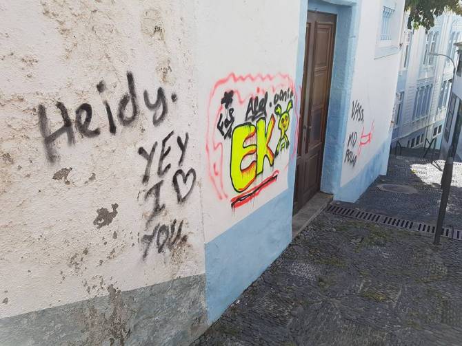 La calle Blas Simón en Santa Cruz de La Palma, a su paso por la zona conocida como Cuesta Matías, ha amanecido este lunes llena de pintadas realizadas durante la noche del domingo.
