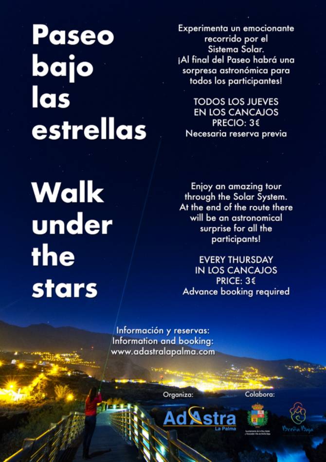 En Los Cancajos, todos los jueves, Ad Astra La Palma organiza la actividad de astroturismo “Paseo bajo las estrellas”, con la colaboración del Ayuntamiento de Breña Baja.