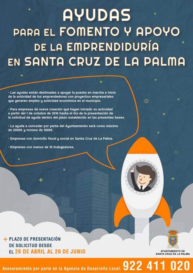 La iniciativa está dirigida a empresas de nueva creación, con menos de diez trabajadores y domicilio social y fiscal en Santa Cruz de La Palma, que hayan iniciado su actividad a partir del 1 de octubre de 2016. El plazo de presentación de solicitudes permanece abierto hasta el 20 de junio y los interesados pueden recibir asesoramiento por parte de la Agencia de Desarrollo Local en el teléfono: 922411020. Las bases de la convocatoria se encuentran disponibles en la web municipal www.santacruzdelapalma.es