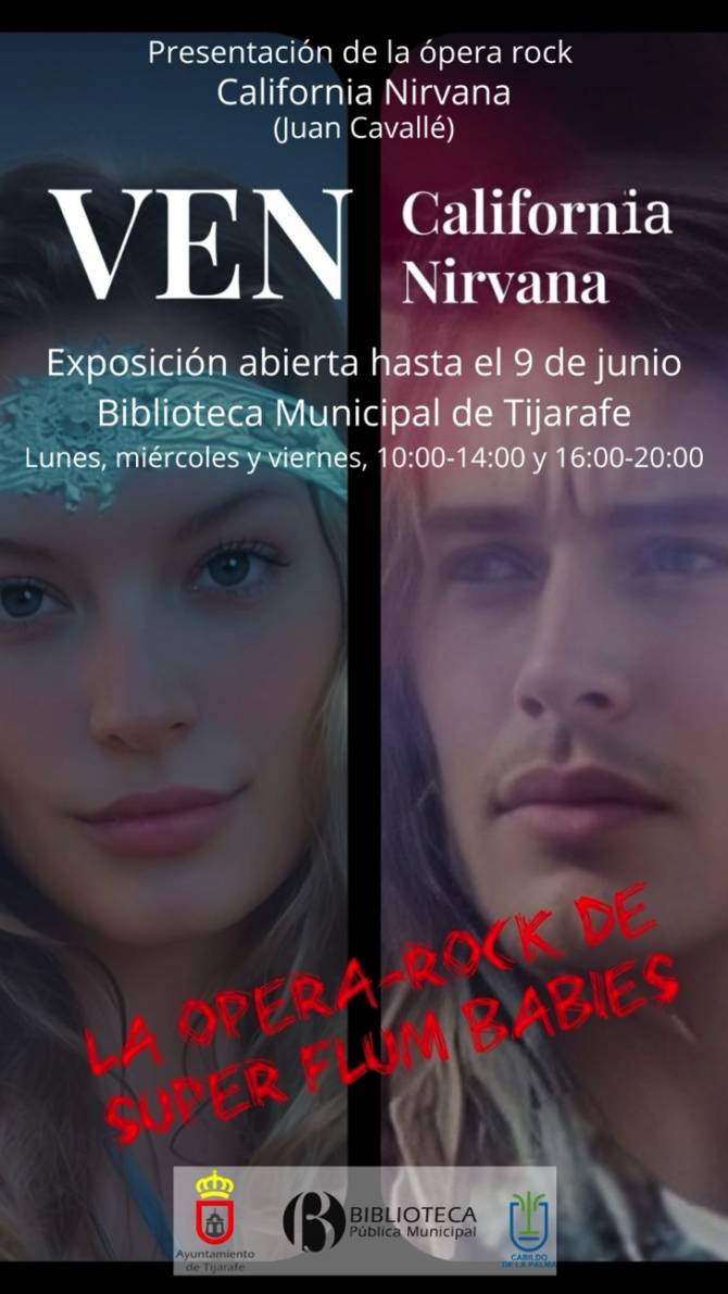 La Biblioteca Municipal de Tijarafe acoge hasta el 9 de junio una exposición sobre la ópera rock California Nirvana, compuesta por el compositor tijarafero Juan Cavallé. Este trabajo musical, aún inédito, ahonda en las raíces históricas y culturales del movimiento hippie. La muestra, organizada por la Concejalía de Cultura del Ayuntamiento de Tijarafe, podrá visitarse los lunes, miércoles y viernes de 10 a 14 y de 16 a 20 horas.