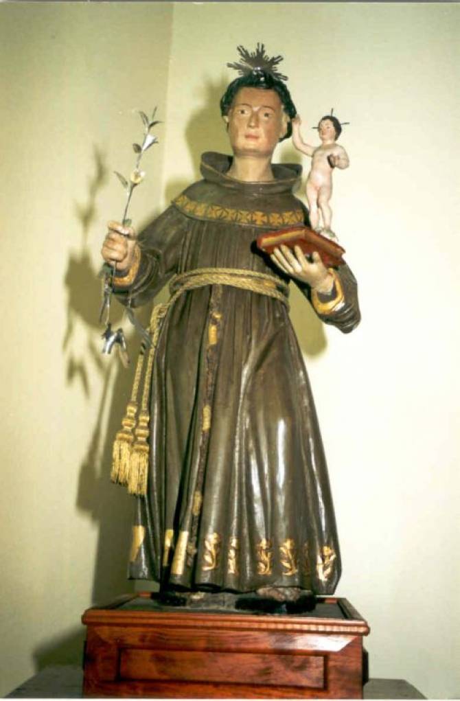 Al franciscano portugués, famoso taumaturgo y predicador, se le representa imberbe, joven (murió en Padua a los 36 años en 1231) y con una ancha tonsura monacal. Como atributos personales, muy frecuentes en su iconografía, porta una fina vara de azucena de plata en su mano derecha, mientras que con la izquierda mantiene al Niño Jesús desnudo y de pie sobre un libro rojo. Se le ha conseguido imprimir una penetrante mirada y grandes ojos, pequeña boca, cuello largo en forzada posición hacia delante.