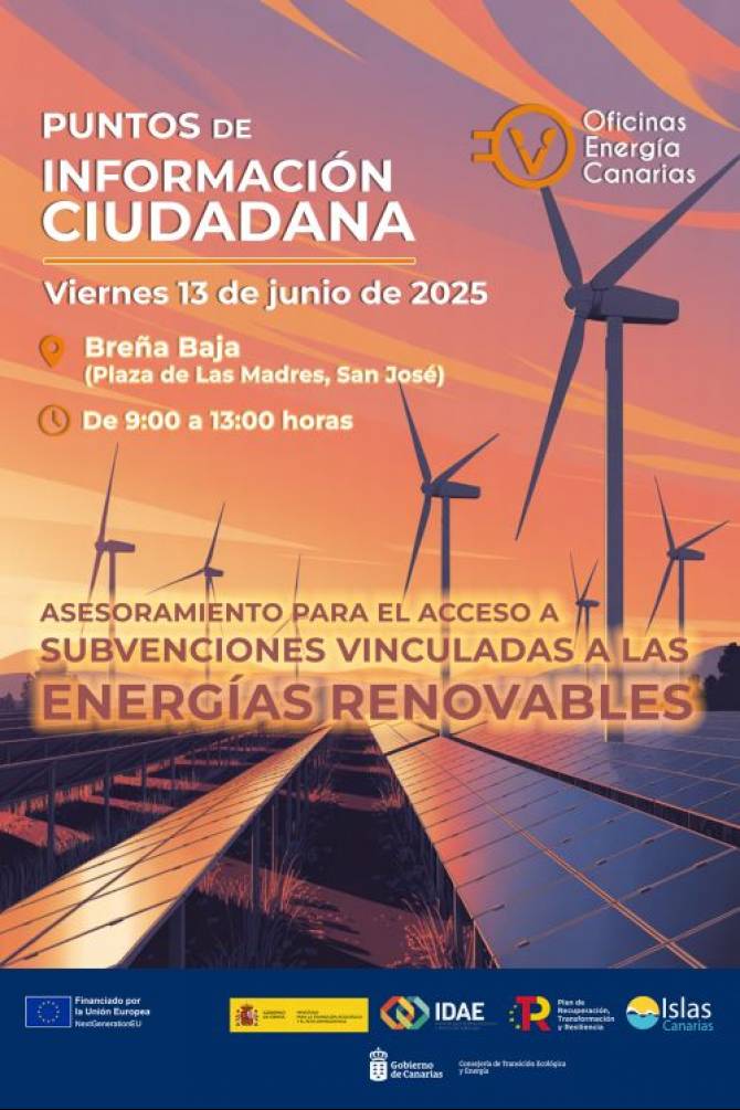 El viernes 13 de junio en horario de 9 a 13 hs habrá un Punto de Información Ciudadana para el asesoramiento del acceso a subvenciones vinculadas a las Energías Renovables en la Plaza de Las Madres de San José por parte de las Oficinas de Energías del Gobierno de Canarias. Con la colaboración del Ayuntamiento de Breña Baja entre otras entidades.
