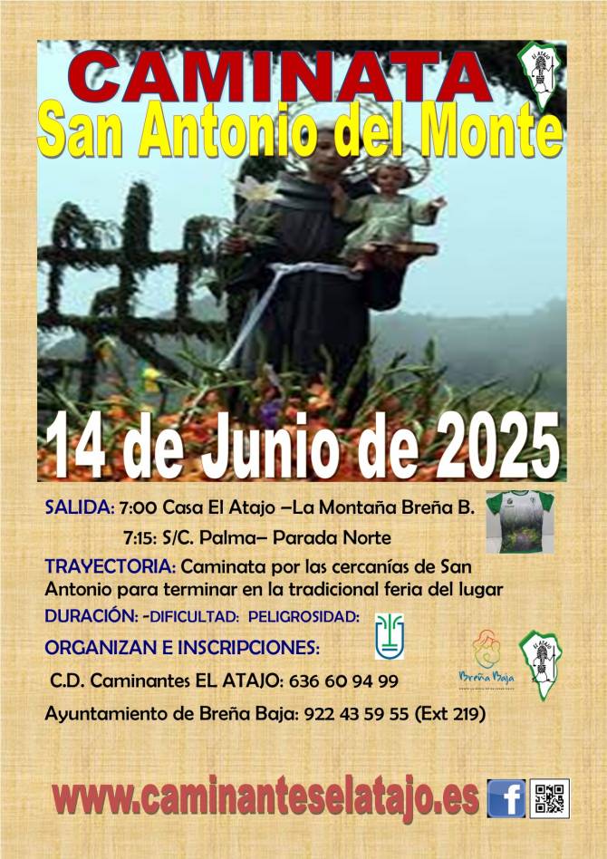El sábado 14 de junio, el C. D. de Caminantes "El Atajo" y la Concejalía de Deportes del Ayuntamiento de Breña Baja organizan, dentro del Programa de Senderismo de Breña Baja, la caminata nº 935 "San Antonio del Monte" de la Villa de Garafía.
