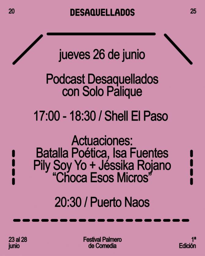 El jueves, 26 de junio, la jornada comenzará con el podcast "Desaquellados con Solo Palique", que tendrá lugar de 17:00 a 18:30 en el espacio Shell El Paso. Por la noche, Puerto Naos acogerá a partir de las 20:30 una velada especial con las actuaciones de Batalla Poética, Isa Fuentes, Pily Soy Yo y Jéssika Rojano en el espectáculo "Choca Esos Micros".