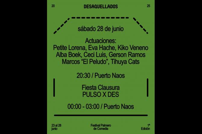 La programación continúa el sábado, 28 de junio, con otra intensa jornada de espectáculos desde las 20:30 en Puerto Naos, con la participación de Petite Lorena, Eva Hache, Kiko Veneno, Tihuya Cats y Estudiantes Academia. La noche culminará con la Fiesta de Clausura PULSO X DES, que se celebrará también en Puerto Naos, desde la medianoche hasta las 03:00, cerrando el festival con una gran celebración.