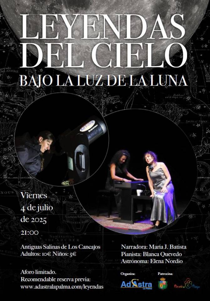 Ad Astra La Palma y el Ayuntamiento de Breña Baja organizan para el viernes 4 de julio, 21 hs, “Leyendas del Cielo bajo la Luz de la Luna” en las Antiguas Salinas de Los Cancajos. Donde los asistentes, descubrirán un verdadero deleite para los sentidos y el alma de la mano de una narradora oral, una pianista y una astrónoma.