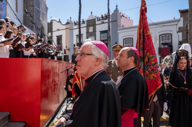 Con este acto, la Virgen de las Nieves se adentraba en Santa Cruz de La Palma presidida por las autoridades eclesiásticas, civiles y militares en una jornada solemne, entre calles engalanadas con ricos damascos y colgaduras elegantes, hasta llegar a la plaza de España, que lucía más vistosa y colorida que nunca gracias al trabajo sabio y experto de las manos de las asociaciones alfombristas de Villa de Mazo y su ayuntamiento, con la confección artesanal del pasillo compuesto de salado, hinojo, faro o sanjuanera, geranio, agapanto y siempreviva y arcos florales.