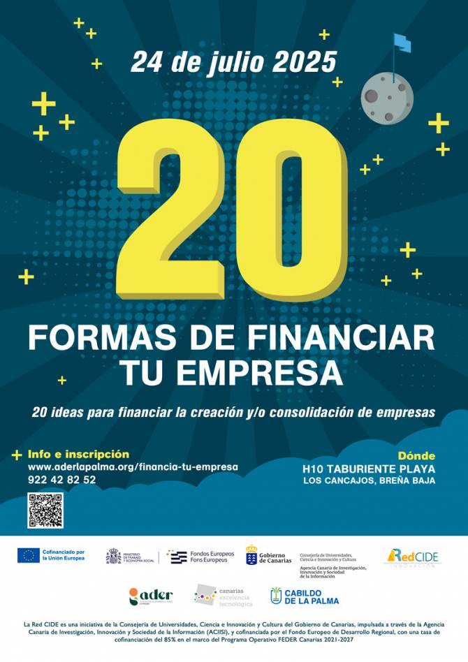 La Asociación para el Desarrollo Rural de la Isla de La Palma (ADER La Palma), el Clúster Canarias Excelencia Tecnológica (CET) y el Servicio de Formación y Empleo del Cabildo de La Palma organizan el próximo jueves 24 de julio la jornada ‘20 formas de financiar tu empresa’, un encuentro de carácter práctico dirigido a pequeñas y medianas empresas, personas emprendedoras, asesorías y técnicos de asesoramiento al emprendimiento interesadas en conocer de forma directa los recursos y programas disponibles para impulsar su actividad económica.