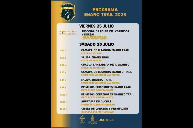 El sábado 26 de julio, a partir de las 08:00 horas, arrancará Enano Trail con dos distancias: la prueba reina de 16 kilómetros con salida en la plaza de España y el trayecto corto de 8 kilómetros cuyo punto de partida será el Real Santuario de las Nieves, con meta ambas pruebas en la plaza de San Francisco.