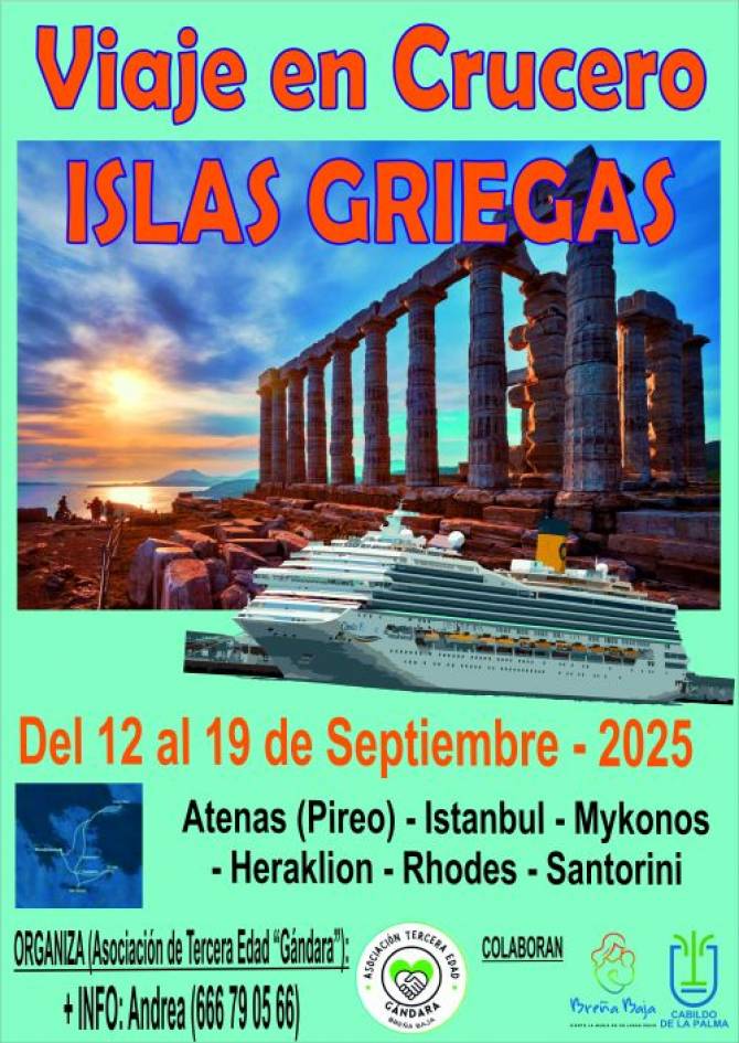 Por primera vez la Asociación de Tercera Edad “Gándara” esta organizando un Viaje en Crucero para las Islas Griegas del 12 al 19 de septiembre con la Compañía Costa Fortuna. Colaboran Ayuntamiento de Breña Baja y Cabildo Insular de La Palma.