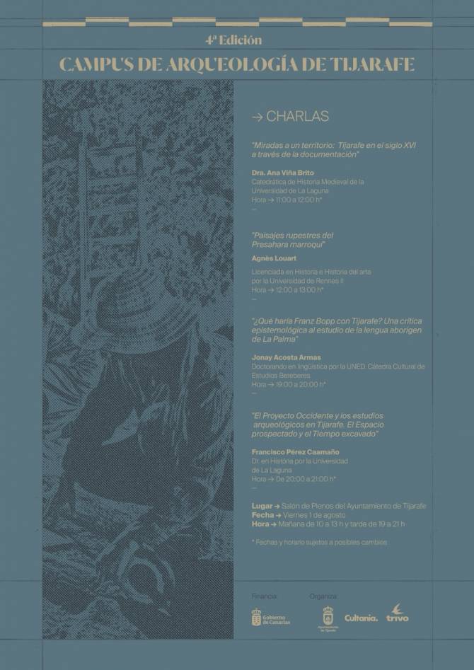 La catedrática de Historia Medieval de la Universidad de La Laguna, Dra. Ana Viña Brito, disertará sobre “Miradas a un territorio: Tijarafe en el siglo XVI a través de la documentación”, mientras que la arqueóloga Agnès Louart tratará los “Paisajes rupestres del Presahara marroquí”. En la jornada de tarde el doctorando en lingüística por la UNED y miembro de la Cátedra Cultural de Estudios Bereberes, Jonay Acosta Armas, propondrá una charla con el título "¿Qué haría Franz Bopp con Tijarafe? Una crítica epistemológica al estudio de la lengua aborigen de La Palma". Finalmente, el doctor en Historia por la Universidad de La Laguna y codirector de la 9ª Campaña arqueológica del Barranco de los Gomeros, Francisco Pérez Caamaño, abordará el tema "El Proyecto Occidente y los estudios arqueológicos en Tijarafe. El Espacio prospectado y el Tiempo excavado”.