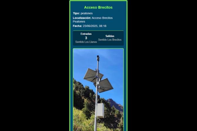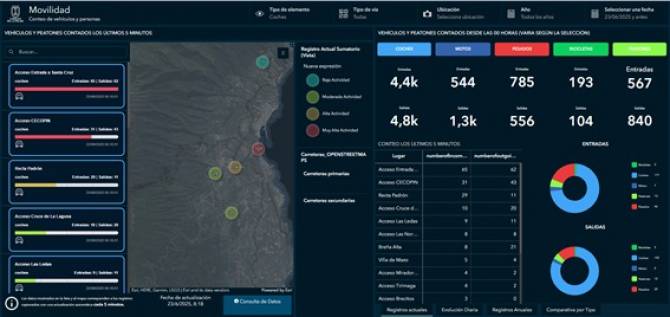 Todos los datos generados se estructuran y visualizan en un cuadro de mando público, accesible desde la aplicación, que ofrece funcionalidades como el conteo actualizado cada cinco minutos; gráficas comparativas por tramos horarios y tipos de vehículos; intensidad media diaria (IMD); monitoreo de tránsito en senderos, y capa de movilidad en tiempo real sobre el mapa insular.