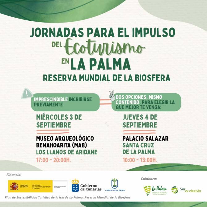El Cabildo de La Palma, a través de la Consejería de Turismo que dirige la consejera Raquel Rebollo, y el Área de Medio Ambiente que lidera la consejera Susa Armas, organiza las Jornadas para el Impulso del Ecoturismo en La Palma en colaboración con la Reserva de la Biosfera.