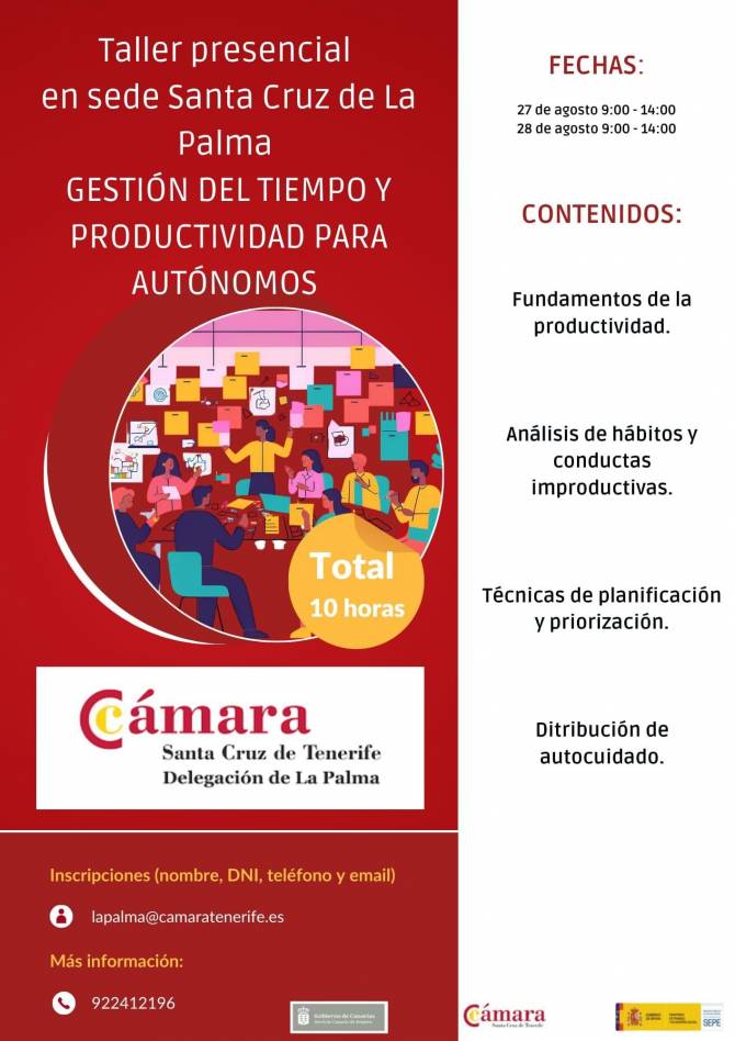 La Cámara Oficial de Comercio, Industria, Servicios y Navegación de Santa Cruz de Tenerife, a través de su delegación en Santa Cruz de La Palma, organiza los próximos días 27 y 28 de agosto, un taller presencial para ayudar a las personas autónomas de la isla a gestionar su tiempo y mejorar su productividad diaria. El encuentro, que se desarrollará desde las 09:00 hasta las 14:00 horas, contará con dos jornadas en las que se combinará tanto contenido teórico como dinámicas participativas para fomentar el intercambio de ideas y la reflexión grupal.