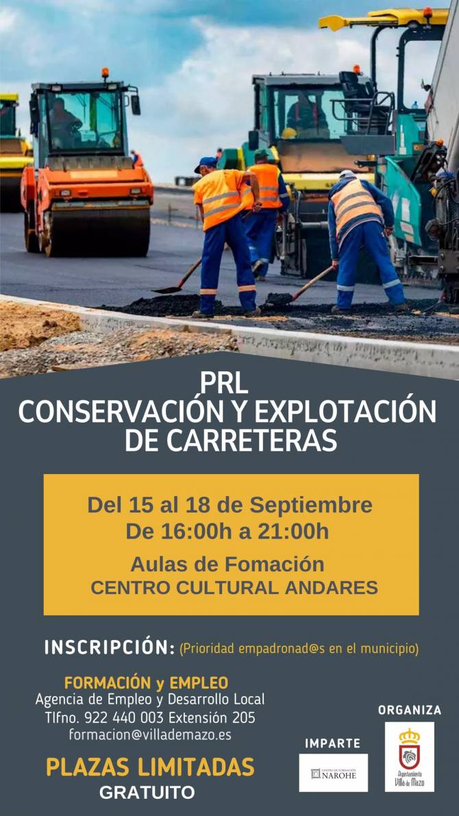 El Ayuntamiento de Villa de Mazo ha lanzado un curso gratuito de Prevención de Riesgos Laborales en Conservación y Explotación de Carreteras. La actividad, que se impartirá en las aulas de formación del Centro Cultural Andares, tendrá lugar entre el 15 y el 18 de septiembre, en horario de 16.00 a 21.00 horas.