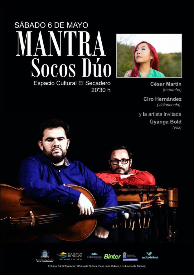 Este sábado a las 20:30 horas, en el Espacio Cultural El Secadero de Los Llanos de Aridane el grupo Socos Dúo presentará su nuevo disco Manta, un repertorio contemporáneo del siglo XXI. En su segundo trabajo discográfico, el tándem compuesto por César Martín a la marimba y Ciro Hernández al violonchelo contará con el acompañamiento de la cantante y compositora norteamericana de origen mongo, Úyanga Bold, que actuará como artista invitada. Las entradas, a un coste de 5 euros, se podrán adquirir una hora antes del comienzo del concierto en la taquilla habilitada en el espacio cultural de El Retamar.