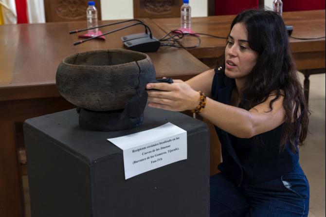 Salomé González Rodríguez, restauradora de la pieza, señaló que que “este proyecto ha sido un desafío abordado con respeto y entusiasmo, siempre priorizando la preservación de la autenticidad de la pieza y asegurando que todos los tratamientos sean reversibles. Cada objeto es único y requiere un enfoque específico; aunque esta vasija presenta patologías similares a otras, cada tratamiento ha sido cuidadosamente adaptado a sus particularidades. Tras el hallazgo, se realizaron reuniones para planificar la recuperación, y durante el levantamiento se aplicó un tratamiento de consolidación que permitió extraer la pieza de manera íntegra, a pesar de las difíciles condiciones de la cueva. Una vez trasladada al Ayuntamiento y al taller temporal de restauración, se llevaron a cabo trabajos de registro fotográfico, toma de muestras, limpieza mecánica y química, consolidación interna y retirada de gasas temporales, asegurando la correcta conservación de este hallazgo excepcional”.