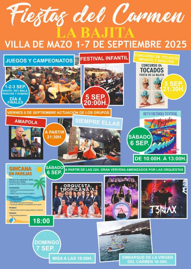 El Ayuntamiento de Villa de Mazo, junto a la Asociación de Vecinos Nuestra Señora del Carmen, ha presentado el programa de actos de las Fiestas del Carmen 2025 en La Bajita, que se celebrarán del 1 al 7 de septiembre con un variado calendario de actividades para todos los públicos.