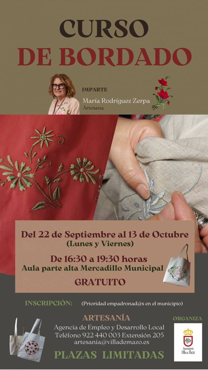 El Ayuntamiento de Villa de Mazo sigue apostando por la formación en oficios artesanales, apostando, en esta ocasión por el bordado. El curso, de carácter gratuito, será impartido por la artesana especializada en este ámbito María Rodríguez Zerpa.