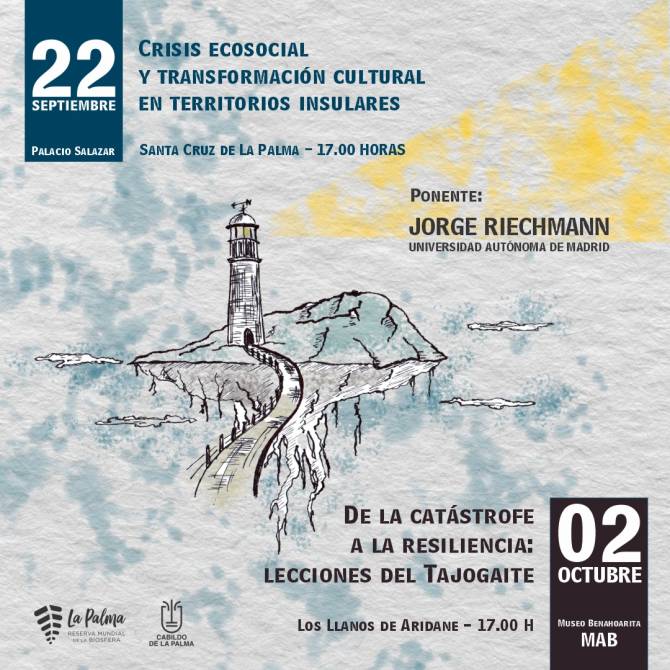 El 22 de septiembre, a las 17:00 horas, en el Palacio de Salazar (Santa Cruz de La Palma), Riechmann impartirá la conferencia “Crisis ecosocial y transformación cultural en territorios insulares”, en la que analizará cómo los territorios isleños viven de forma amplificada los retos de sostenibilidad y la necesidad de transformaciones culturales.
