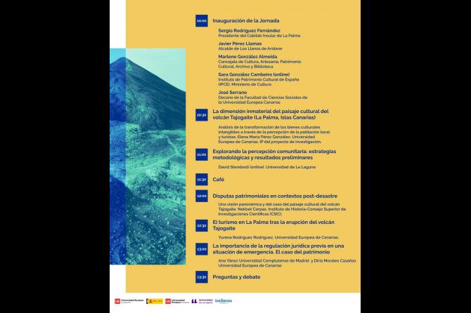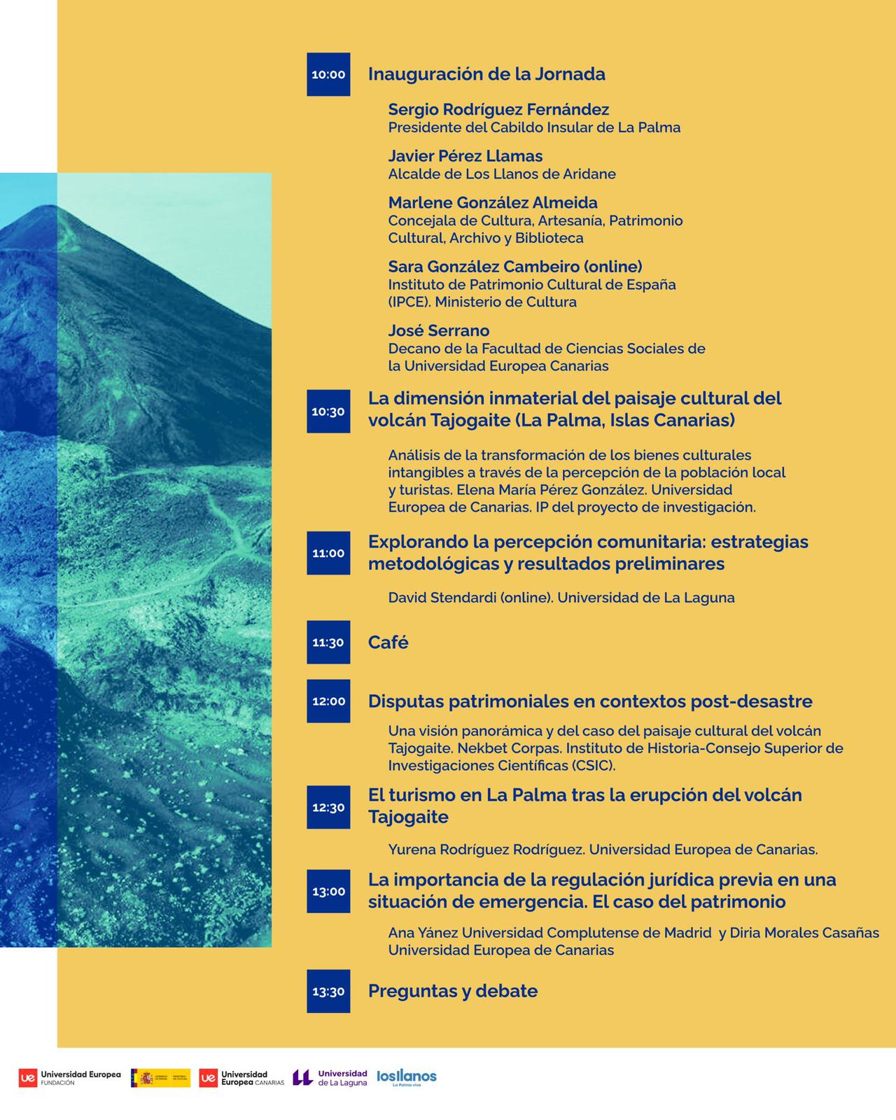 La jornada abordará el impacto cultural, social y turístico de la erupción del Tajogaite, con ponencias sobre memoria colectiva, patrimonio inmaterial, gestión cultural y marcos normativos. Por la tarde se realizará un grupo focal con colectivos locales para recoger experiencias y propuestas.