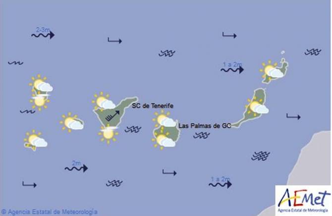 El viento soplará variable flojo con predominio de la componente Oeste principalmente a partir de la tarde; brisas en costas; en medianías y cumbres, componente oeste.